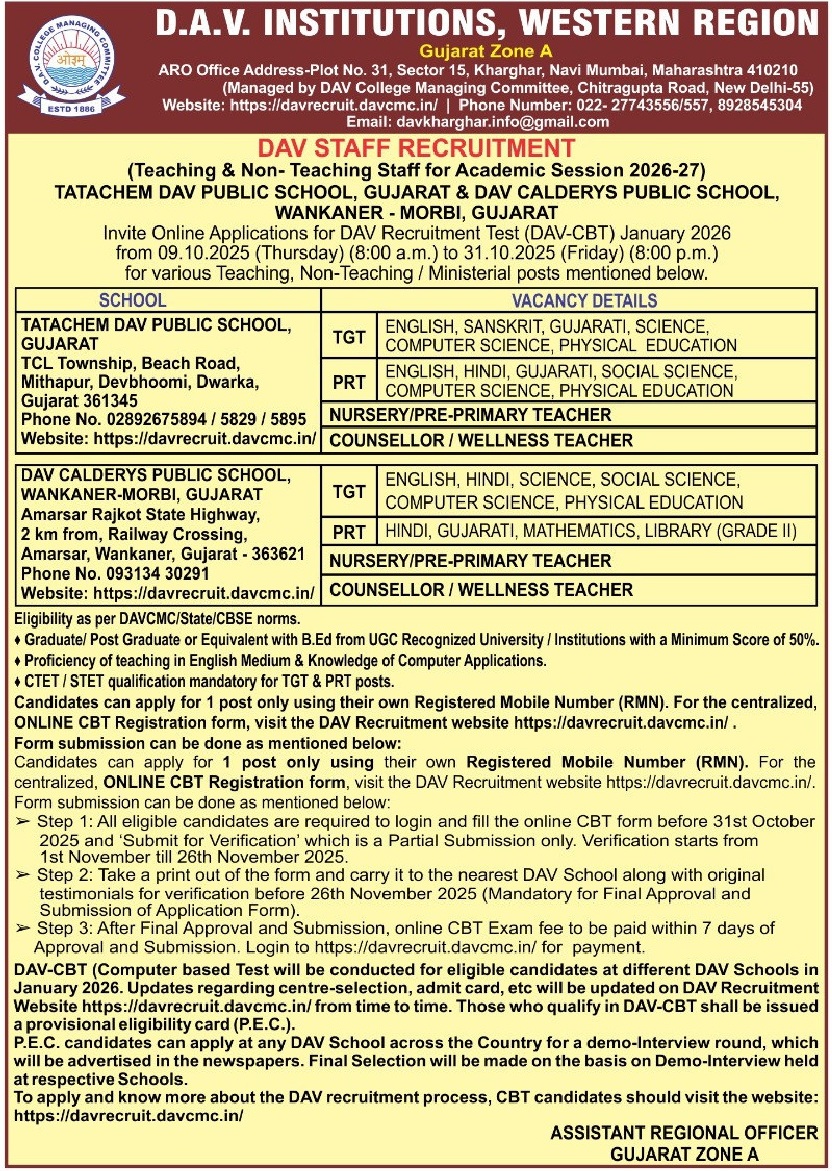 DAV CALDERYS PUBLIC SCHOOL (Under DAV College Managing Committee, New Delhi) Wankaner Rajkot State Highway, 2 km from Amarsar Railway Crossing, Wankaner, Distt. Morbi, Gujarat-363621 Phone No.: 93134-30291 E-Mail: dav.calderys@gmail.com